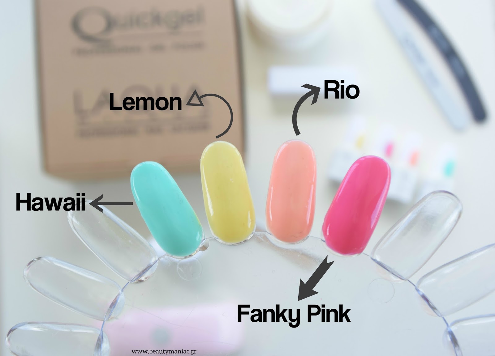 Επισκέφθηκα λοιπόν το κατάστημα της Quickgel στη Θεσσαλονίκη, και ενθουσιάστηκα με την τεράστια ποικιλία χρωμάτων που διαθέτει! Μπορείς να βρεις πάνω από 200 διαφορετικά χρώματα, για να διαλέξεις αυτά που σου αρέσουν. Επέλεξα λοιπόν 4 mini χρώματα από την τελευταία ανοιξιάτικη συλλογή της εταιρίας, με πανέμορφες αποχρώσεις ιδανικές τόσο για την άνοιξη όσο και για το καλοκαίρι. Το Fanky Pink, που είναι ένα φανταστικό και έντονο φούξια, το Lemon που έχει την ιδανική, κίτρινη απόχρωση που είναι διακριτική και εντυπωσιακή ταυτόχρονα, το όμορφο και διακριτικό ροδακινί Rio και τέλος το εντυπωσιακά καλοκαιρινό βερνίκι που λέγεται Hawaii. το Φυσικά δεν παρέλειψα το top coat και το base coat. Κατά τη γνώμη μου, αν δεν είσαι επαγγελματίας καλύτερα να επιλέξεις mini βερνίκια διότι στα 7.5ml είναι καλά σαν ποσότητα για μανικιούρ στο σπίτι. Για να πολυμεριστεί το ημιμόνιμο βερνίκι της Quickgel χρειάζεται είτε λάμπα UV, είτε λάμπα led οπότε διάλεξα τη δεύτερη. Έχει ένα τέλειο, ροζ χρώμα και χρειάζεται μόνο 30 δευτερόλεπτα ώστε να πολυμερίσει τα βερνίκια.
